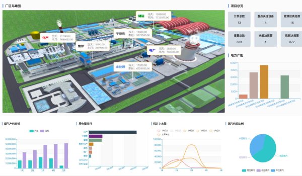 支持数据自动采集、过程监控、能源调度优化、能源平衡、能源成本核算、统计报表,实现各类能源介质和重点耗能设备的集中管控。